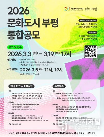 브릿지저널 김경미 기자 | 부평구문화재단은 오는 19일까지 ‘2026년 문화도시부평 통합공모’ 참여자를 모집한다고 밝혔다.