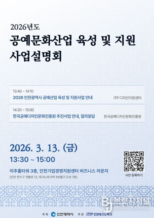 브릿지저널 김경미 기자 | 인천테크노파크(인천TP)는 오는 13일 인천기업경영지원센터(송도 미추홀타워 3층)에서 ‘2026년도 인천광역시 공예문화산업 육성 및 지원사업 설명회’를 개최한다고 밝혔다.