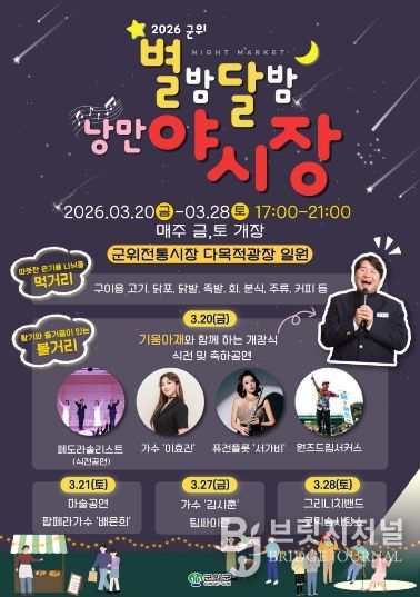 브릿지저널 정보영 기자 | 군위군은 전통시장에 활력을 불어넣고 군민과 방문객들에게 봄밤의 추억을 선사하기 위해 '군위전통시장 별밤달밤 낭만 야시장'을 오는 3월 20일 개장해 3월 28일까지 매주 금요일과 토요일 운영한다고 밝혔다.