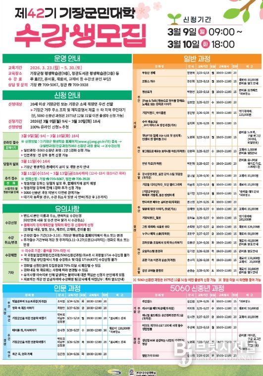브릿지저널 윤나영 기자 | 기장군은 오는 9일부터 10일까지 2일간 ‘2026년 제1기 평생학습강좌(기장군민대학·기장군민어학당) 수강생을 모집한다고 6일 밝혔다.