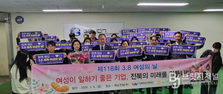 브릿지저널 윤나영 기자 | 전북특별자치도는 6일 제118회 세계 여성의 날을 맞아 전북여성가족재단, 농협중앙회 전북본부와 함께 여성친화기업 제논전장㈜를 방문해 여성 근로자들을 격려하고 성평등 조직문화 확산을 위한 기념행사를 개최했다.