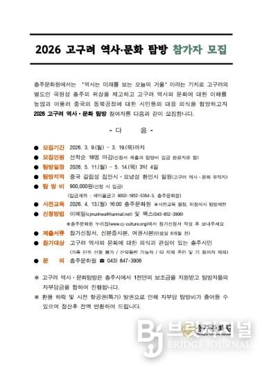 브릿지저널 김경미 기자 | 충주문화원(원장 유진태)이 중국 길림성 집안시와 요녕성 환인시에 위치한 고구려 역사·문화 유적을 탐방할 답사자 18명을 선착순 모집한다.
