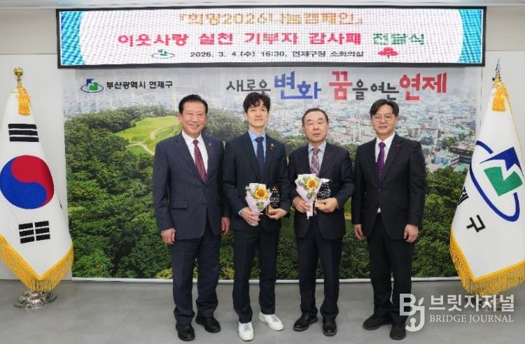 브릿지저널 윤나영 기자 | 연제구는 지난 3월 4일, 부산사회복지공동모금회(회장 이수태)와 함께 '희망2026나눔캠페인 이웃사랑 실천 기부자'에게 감사패를 전달했다.