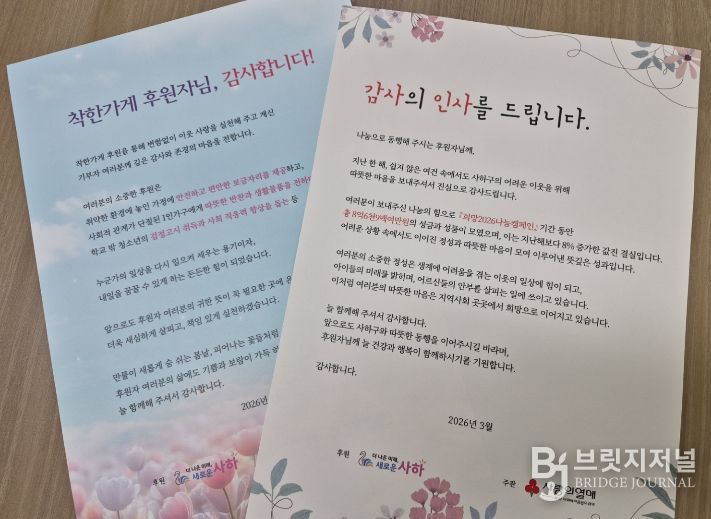 브릿지저널 윤나영 기자 | 부산 사하구는 지난 5일 '희망2026나눔캠페인'에 참여한 기부자와 '착한가게' 후원자들에게 감사의 마음을 담은 서한문을 발송했다고 밝혔다.
