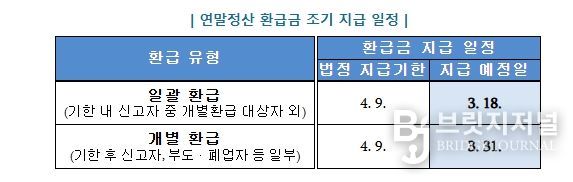 연말정산 환급금의 법정 지급기한은 4월 9일이지만, 국세청은 그보다 22일 이른 3월 18일에 연말정산 환급금을 회사에 지급할 예정이다.