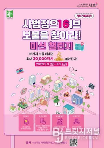 브릿지저널 김경미 기자 | 서울 서초구는 서초역 일대 ‘아·태 사법정의 허브’의 주요 명소를 널리 알리고 주민 참여를 확대하기 위해 3월 9일부터 4월 3일까지 약 한 달간 '사법정의 허브 보물을 찾아라! 미션 챌린지'를 진행한다고 밝혔다.