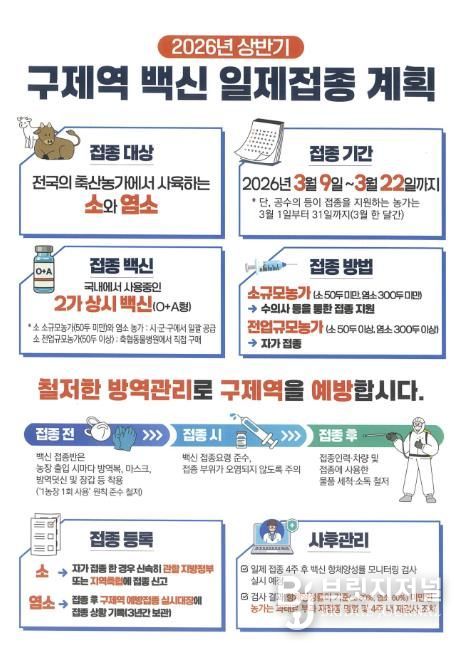 브릿지저널 윤나영 기자 | 홍천군은 구제역 유입 방지와 완전 차단을 위해 상반기 구제역 일제 백신접종을 실시한다. 대상은 1,001 농가 36,830두(소 928 농가 33,566두, 염소 73 농가 3,264두) 사육 농가이다.