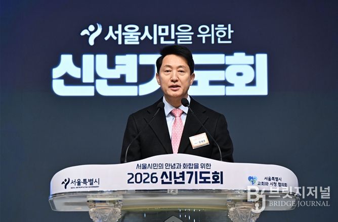 브릿지저널 김경미 기자 | 오세훈 서울시장은 9일 오전 7시 20분, 신길교회(영등포구 영등포로67가길 9)에서 서울특별시교회와시청협의회 주최로 열린 ‘2026 신년기도회’에 참석해 서울 시민의 안녕과 화합을 위해 기도했다.