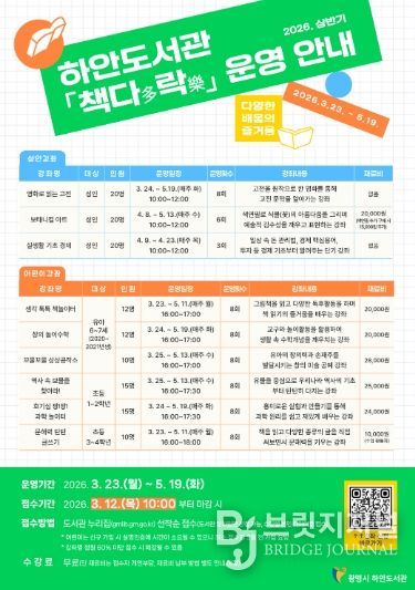 브릿지저널 김경미 기자 | 광명시 하안도서관은 상반기 정기 독서문화 프로그램 ‘책다(多)락(樂)’ 수강생을 오는 12일부터 모집한다.