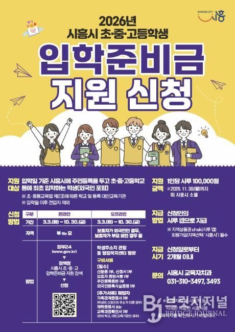 브릿지저널 김경미 기자 | 시흥시는 지난 3월 3일부터 ‘시흥시 초중고 입학준비금 지원사업’ 신청을 받고 있다. 이번 사업은 입학 준비에 필요한 비용을 보편적으로 지원해 교육기본권을 강화하고 학부모의 경제적 부담을 완화하기 위해 올해 처음 시행되는 제도다.