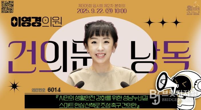 브릿지저널 김경미 기자 | 성남시의회 이영경 의원(서현1, 2동)은 성남시가 영장산과 불곡산 일대 산책로에 QR코드를 활용한 범죄예방 신고 서비스를 도입한 것과 관련해 “시민 안전을 위한 의미 있는 조치”라며 성남시 집행부에 감사의 뜻을 전했다.