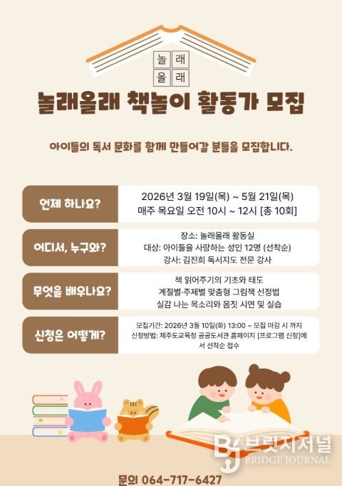 브릿지저널 정보영 기자 | 제주도교육청 제주도서관은 19일부터 성인을 대상으로 전문적인 책놀이 활동가 양성을 위한 ‘놀래올래 책놀이 활동가 교육’ 프로그램을 운영한다.