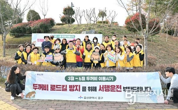 브릿지저널 윤나영 기자 | 울산 중구가 3월 10일 오후 1시 장현저류지 일대에서 민관합동 두꺼비 찻길 사고(로드킬) 방지 활동을 펼쳤다.