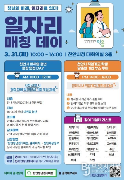 브릿지저널 정보영 기자 | 천안시가 ‘2026년 청년 일자리 매칭데이’ 참여자를 모집한다고 11일 밝혔다.