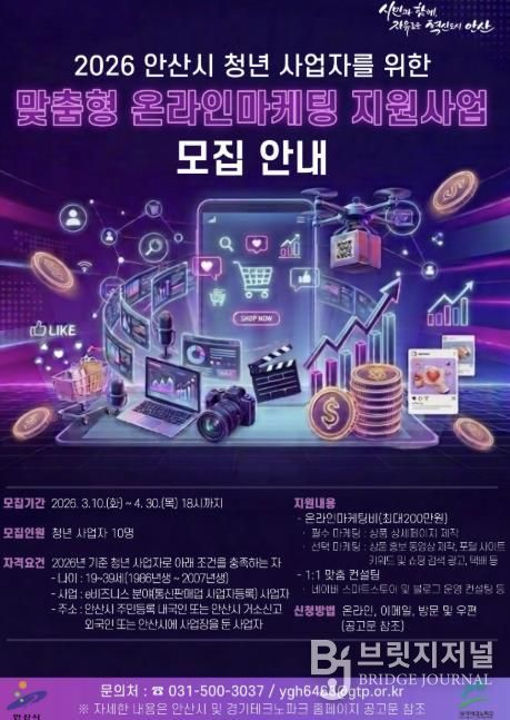 브릿지저널 김경미 기자 | 안산시는 온라인 시장에서 상품 홍보와 매출 확대를 희망하는 청년 사업자를 대상으로 ‘맞춤형 온라인마케팅 지원사업’ 참여자를 모집한다고 11일 밝혔다.