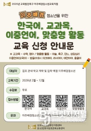 이번 프로그램은 올해 12월까지 김포시 상호문화교류센터를 중심으로 진행되며, 관내 이주배경청소년을 대상으로 한국어 교육과 교과학습 지원 등 맞춤형 교육을 제공한다.