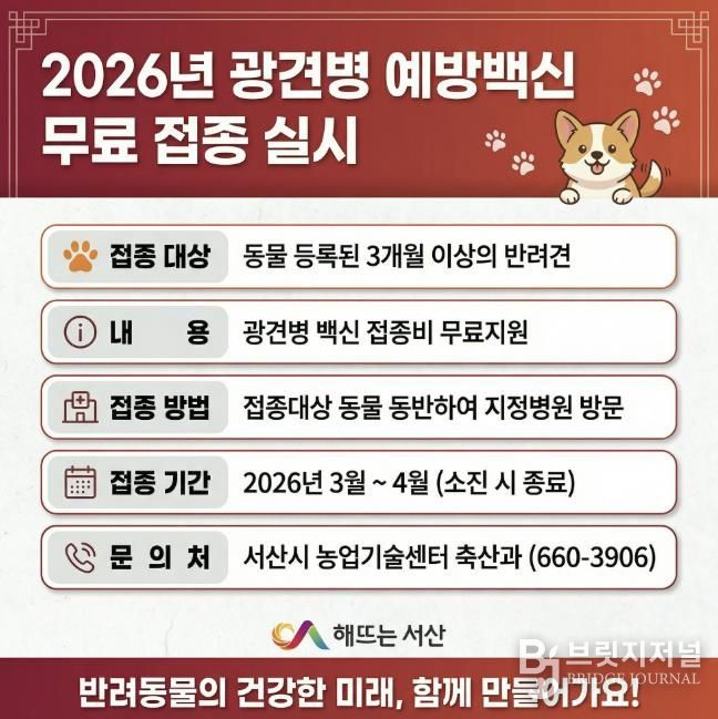 브릿지저널 정보영 기자 | 충남 서산시는 관내 반려견을 대상으로 광견병 예방백신 무료 접종을 지원한다고 밝혔다.