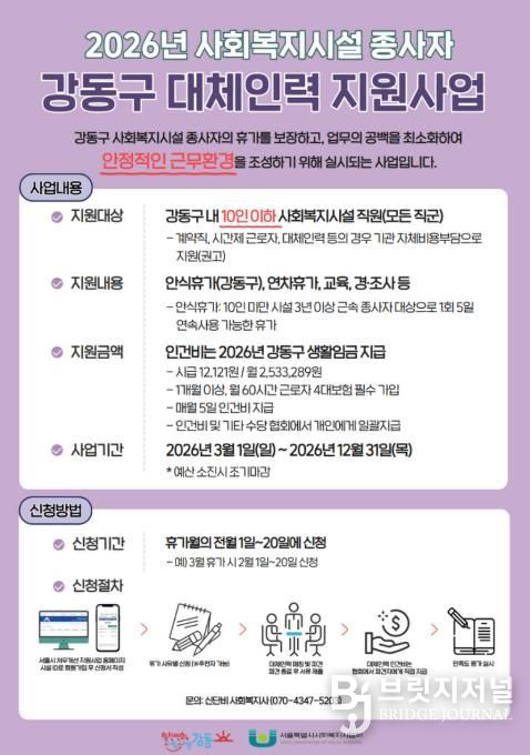 브릿지저널 김경미 기자 | 서울 강동구는 소규모 사회복지시설의 업무 공백을 줄이고 종사자의 휴식권을 보장하기 위해 ‘사회복지시설 종사자 대체인력 지원사업’을 추진한다고 밝혔다.