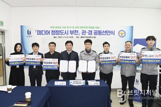 브릿지저널 김경미 기자 | 부천시와 부천원미경찰서는 지난 11일 중앙지구대에서 ‘미디어 청정도시 부천’ 관·경 공동 선언식을 열고 공공장소 촬영 질서 확립을 위한 협력 대응을 강화하기로 했다.