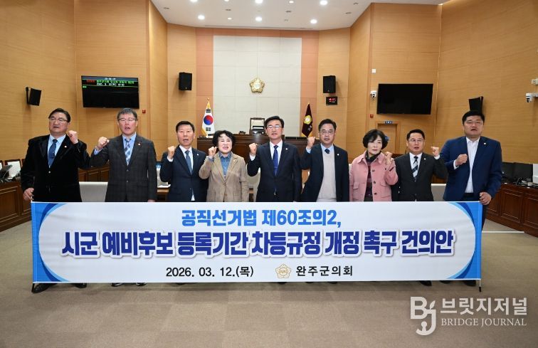 브릿지저널 윤나영 기자 | 완주군의회는 12일 열린 제299회 임시회 제2차 본회의에서 심부건 의원이 대표 발의한 ‘공직선거법 제60조의2 시·군 예비후보 등록기간 차등 규정 개정 촉구 건의안’을 만장일치로 채택했다.