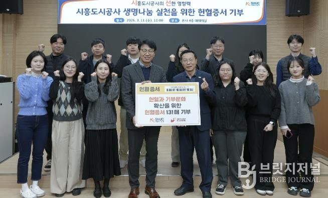브릿지저널 김경미 기자 | 시흥도시공사는 지난 11일 임직원 단체 헌혈 행사를 통해 직원들에게 기부받은 ‘헌혈증 131매’를, 대한산업보건협회 한마음혈액원에 전달하면서 ‘생명 나눔’을 실천했다고 밝혔다.