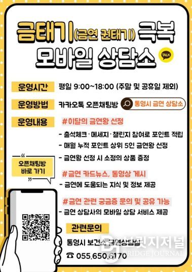 브릿지저널 김경미 기자 | 통영시는 금연 시도자들이 겪는 이른바 ‘금태기(금연 권태기)’를 효과적으로 극복할 수 있도록 돕는 ‘모바일 금연 상담소’를 올해 확대 운영한다고 12일 밝혔다.