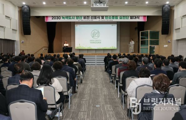 브릿지저널 김경미 기자 | 양산시는 2026년 3월 12일 양산비즈니스센터 컨벤션홀에서 '2030 녹색도시 양산' 비전 선포식과 탄소중립 실천단 발대식을 개최하고, 지속가능한 녹색도시로의 본격적인 전환을 공식 선언했다.