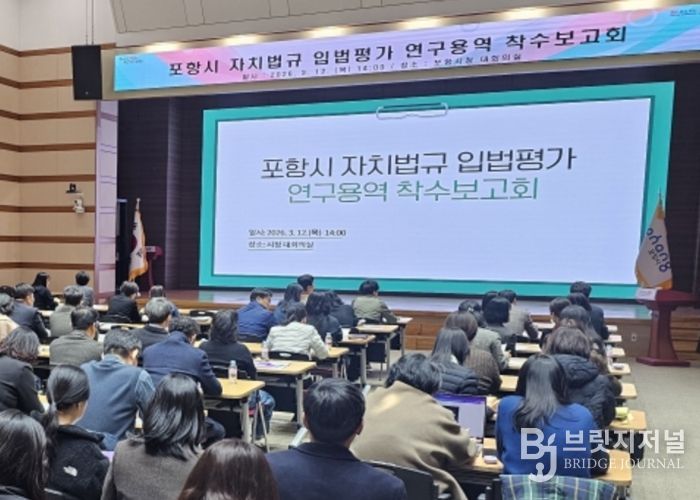 브릿지저널 정보영 기자 | 포항시는 12일 시청 대회의실에서 자치법규 소관 부서장 및 팀장과 용역수행기관 관계자 등 100여 명이 참석한 가운데 ‘포항시 자치법규 입법평가 연구용역 착수보고회’를 개최했다.