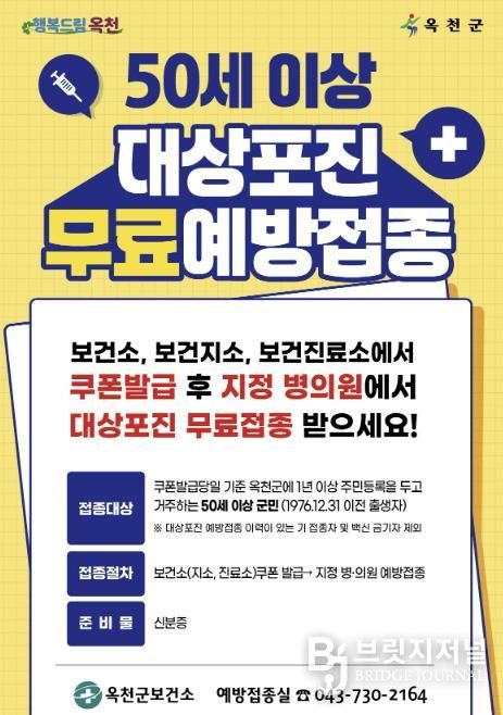 브릿지저널 김경미 기자 | 옥천군보건소가 50세 이상 옥천군민을 대상으로 대상포진 무료 예방접종을 시행한다고 밝혔다.