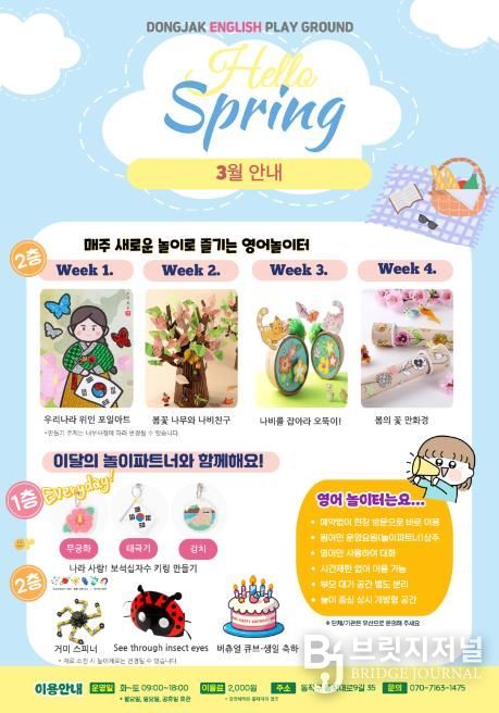 동작어린이영어놀이터에서는 3월 3일부터 31일까지 ‘헬로 스프링(Hello Spring)’을 주제로 영유아 및 초등 저학년을 위한 테마활동과 원데이 클래스를 선보인다.