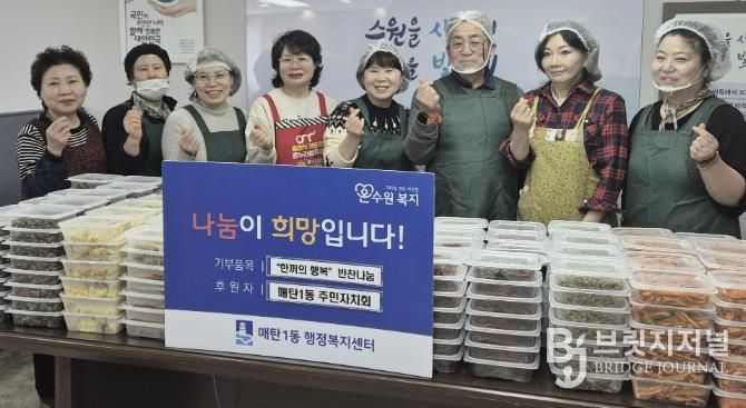 브릿지저널 김경미 기자 | 영통구 매탄1동은 지난 12일 매탄1동 주민자치회가 지역 내 취약계층을 위한 ‘한끼의 행복’ 반찬 나눔 봉사를 행정복지센터에서 진행했다고 밝혔다.