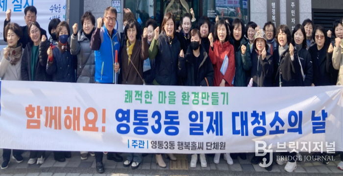 브릿지저널 김경미 기자 | 수원시 영통구 영통3동 행정복지센터는 지난 12일 새봄을 맞아 쾌적하고 깨끗한 마을 환경 조성을 위해 통장협의회와 함께 ‘새봄맞이 일제 대청소의 날’을 실시했다.