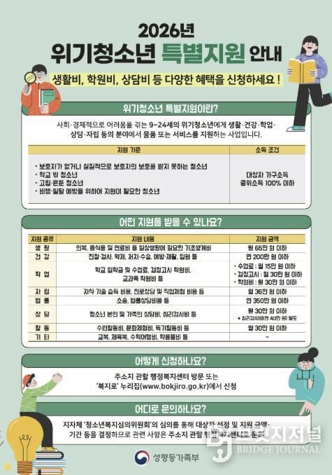 브릿지저널 김경미 기자 | 동두천시는 2026년 ‘위기청소년 특별지원’과 관련해 사회·경제적으로 어려움을 겪는 관내 위기청소년들에게 다양한 혜택을 제공하기 위한 신청을 3월 30(월)까지 받는다고 밝혔다.