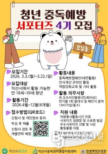 익산시는 중독관리통합지원센터에서 만 18~39세 청년을 대상으로 오는 22일까지 '청년 중독 예방 서포터즈 4기'를 모집한다고 13일 밝혔다.