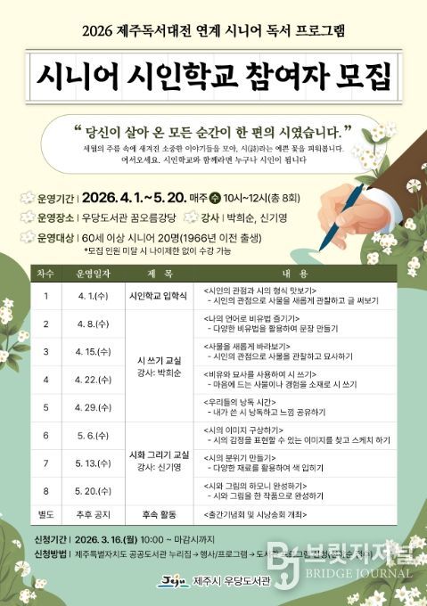 브릿지저널 정보영 기자 | 제주시 우당도서관은 2026 제주독서대전과 연계해 시민의 삶과 경험을 문학적 가치로 재발견하는 특별 프로그램인 ‘시니어 시인학교’ 참여자를 모집한다.