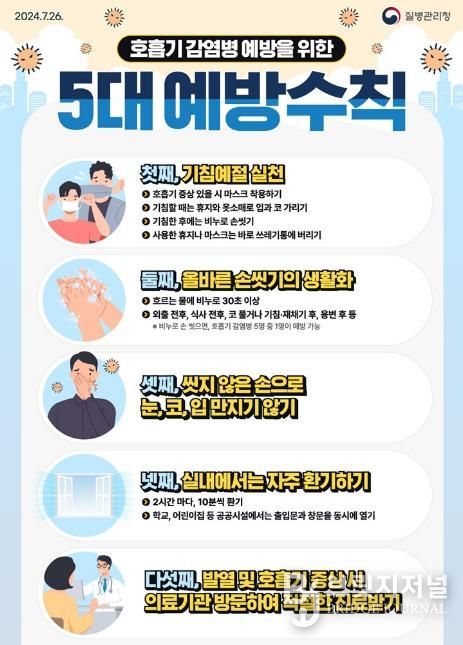 감염병 예방을 위한 주요 수칙으로는 ▲흐르는 물에 비누로 30초 이상 손 씻기 ▲기침‧재채기 시 옷소매로 입과 코 가리기 ▲발열‧기침 등 호흡기 증상 시 등교 및 등원 자제 ▲실내 자주 환기하기 ▲호흡기 증상 시 마스크 착용 후 의료기관 방문 ▲수두, MMR 등 연령별 예방접종 실시 등이 있다.