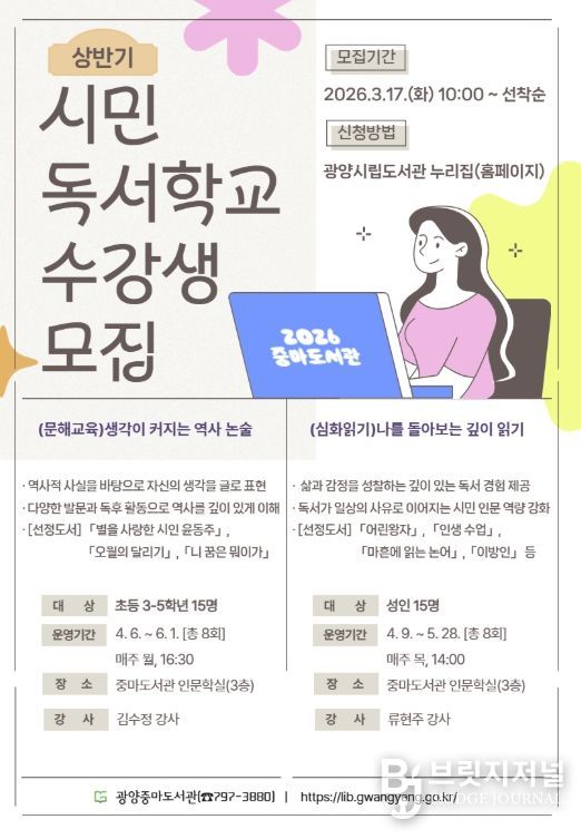 브릿지저널 김경미 기자 | 광양중마도서관이 시민들의 인문 독서 역량을 높이고 독서를 통해 사유와 소통의 기회를 제공하기 위해 ‘2026년 상반기 시민독서학교’ 프로그램 수강생을 모집한다.