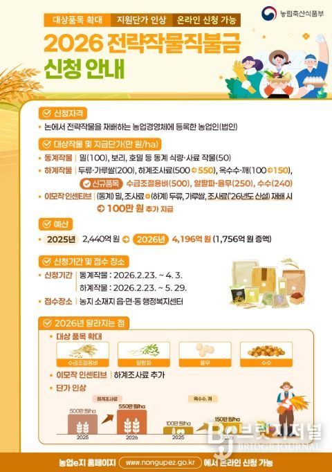 올해부터 전략작물직불제 하계 조사료 지원단가는 ha당 500만 원에서 550만 원으로 인상된다. 동계 밀·조사료와 하계 두류·가루쌀·조사료를 재배하는 이모작의 경우 ha당 100만 원이 추가 지원돼 논을 활용한 조사료 재배 확대가 기대된다.