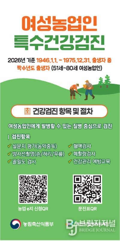 브릿지저널 김경미 기자 | 옹진군은 올해 처음으로 여성농업인의 건강권 보호를 위한'여성농업인 특수건강검진사업'을 본격 시행한다고 밝혔다.