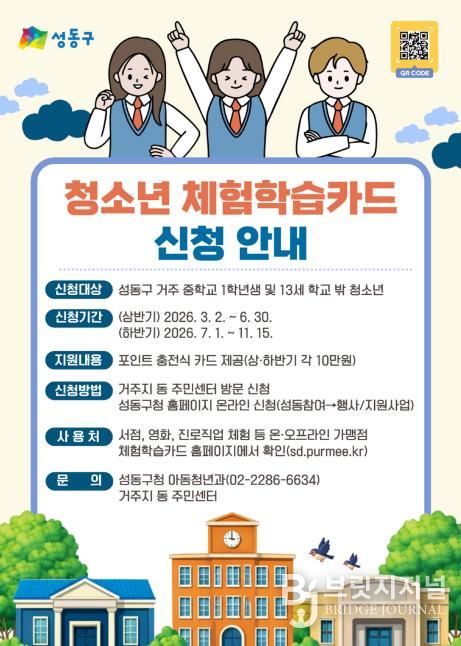 브릿지저널 김경미 기자 | 서울 성동구는 청소년들에게 진로, 문화, 예술 등 다양한 체험활동 기회를 제공하기 위해 연간 최대 20만 원의 ‘청소년 체험학습카드’를 지원한다고 밝혔다.