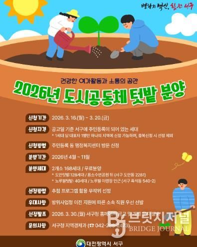 브릿지저널 정보영 기자 | 대전 서구는 이달 20일까지 도심 속 농업 체험을 위한 ‘도시 공동체 텃밭 분양’ 참가자를 모집한다고 16일 밝혔다.