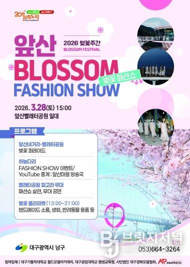브릿지저널 김진석 기자 | 대구 남구는 오는 3월 28일 지역의 대표 관광명소인 앞산빨래터공원에서 벚꽃패션쇼 이벤트를 개최한다고 밝혔다.