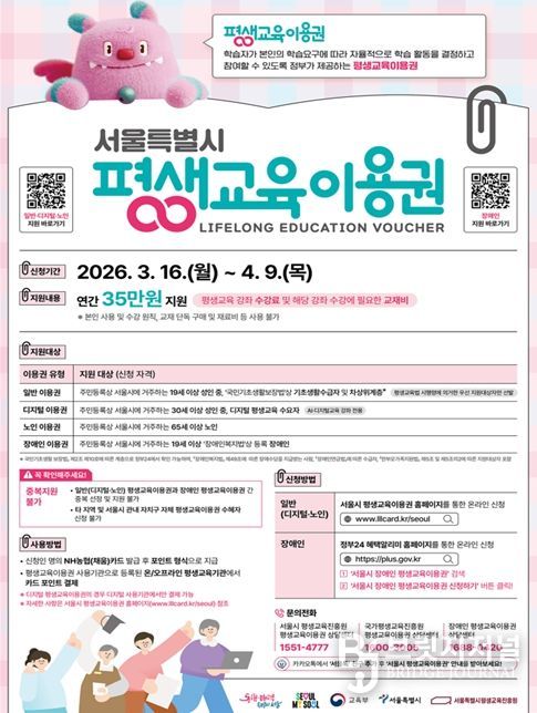 서울시는 16일 오전 10시부터 4월 9일 18시까지 ‘2026년 평생교육이용권’ 지원을 받을 시민들을 모집한다고 밝혔다.