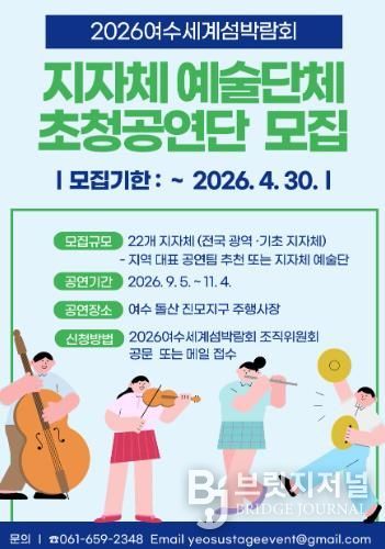 브릿지저널 김경미 기자 | 2026여수세계섬박람회 조직위원회가 ‘섬, 바다와 미래를 잇다’를 주제로 지역별 특색있는 볼거리를 제공하기 위해 지자체 예술 공연단체를 모집한다.