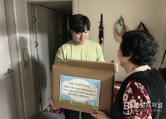 브릿지저널 김진석 기자 | 다원 기부문화봉사단은 지난 15일, 동구 방촌동 일대 저소득 홀몸 어르신 세대를 직접 방문해 생필품 꾸러미 25상자(200만원 상당)를 전달했다.