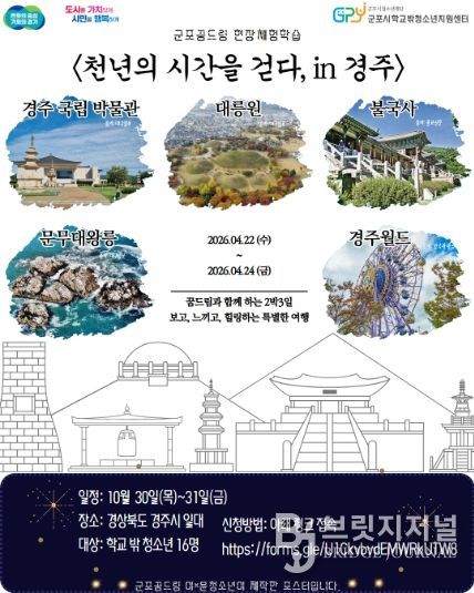 브릿지저널 김경미 기자 | (재)군포시청소년재단(대표이사 김덕희) 군포시학교밖청소년지원센터(센터장 강연미)는 학교 밖 청소년 16명을 대상으로 오는 4월 22일부터 24일까지 2박 3일간 경상북도 경주시 일대에서 ‘역사캠프 현장체험학습 프로그램’을 운영한다고 밝혔다. 참가신청은 구글폼 등을 통해 접수 받은 뒤 신청 내용을 바탕으로 참여 대상자를 선정할 예정이다.