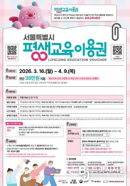 브릿지저널 김경미 기자 | 서울 도봉구가 2026년 평생교육이용권 신청자를 4월 9일까지 접수한다.