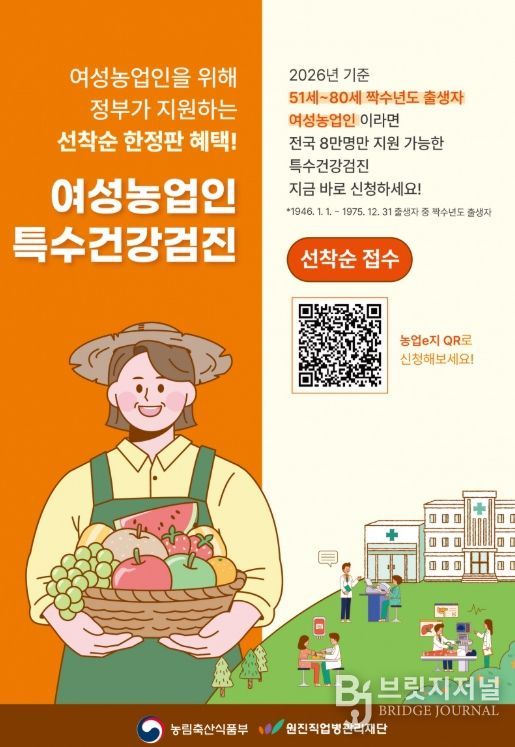 이 사업은 여성농업인을 대상으로 근골격계·심혈관계 질환 등의 질병을 조기에 진단하고, 전문의 상담 등을 통해 예방·사후 관리할 수 있도록 2년 주기로 검진받도록 돕는 사업이다.