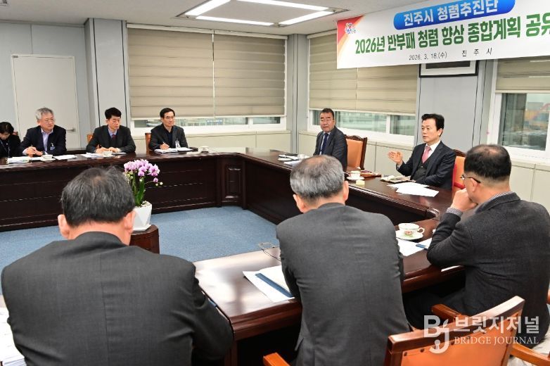 브릿지저널 김경미 기자 | 진주시는 18일 시장을 단장으로 부시장과 국·소장, 감사관으로 구성된 ‘청렴 추진단’이 참석한 가운데 ‘2026년 반부패 추진 계획 공유를 위한 청렴 추진단 회의’를 개최했다고 밝혔다.