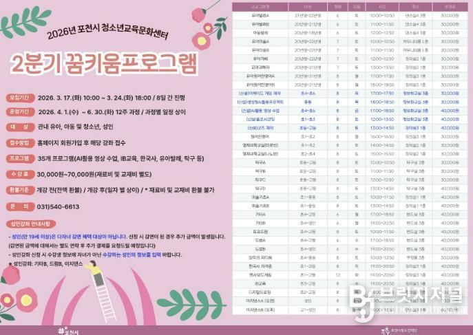 브릿지저널 김경미 기자 | 포천시청소년재단 포천시청소년교육문화센터는 관내 청소년과 지역 주민의 자기계발 및 역량 강화를 지원하기 위해 2026년 2분기 꿈키움프로그램 수강생을 모집한다.